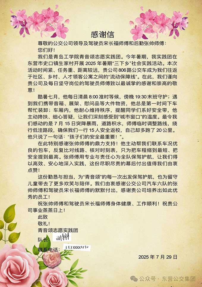 近日,青島工學(xué)院青音頌志愿團(tuán)發(fā)來一封感謝信,感謝東營市公交集團(tuán)駕駛員宋長福師傅熱情服務(wù)。