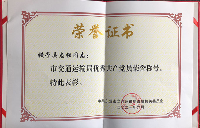 吳志強榮獲”市交通運輸局優秀共產黨員“榮譽稱號